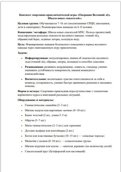 Готовый конспект приключенческой игры «Операция Весенний лёд. Школа юных спасателей» — это профессиональный инструмент для обучения детей 7–16 лет правилам поведения в период паводка. Вместо скучного инструктажа вы получаете захватывающий квест, который моделирует реальные угрозы весенней реки. Этот материал экономит до 5 часов вашей работы на планирование, предлагая методически выверенную структуру согласно требованиям ФГОС.