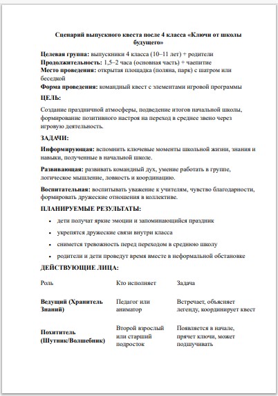 Готовый сценарий выпускного квеста «Ключи от школы будущего» — это идеальное решение для яркого и методически выверенного завершения начальной школы. Этот конспект избавляет педагога от долгой подготовки, предлагая полностью проработанную игровую программу на 1,5–2 часа, которая легко адаптируется под открытую площадку, парк или пришкольный участок.