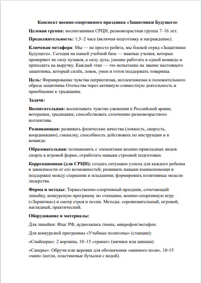 Конспект военно-спортивного праздника «Защитники Будущего»: сценарий квеста для СРЦН и школ (7–16 лет)
