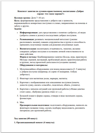 Ключевая идея занятия: доброта бывает разной — словом и делом, а добрые поступки, как бумеранг, возвращаются и делают счастливым того, кто их совершил. Ваши воспитанники пройдут через ряд увлекательных активностей: от игры «Передай улыбку» и анализа мультфильма до ролевого моделирования ситуаций и создания коллективного плаката «Сердце доброты». Занятие помогает детям освоить понятия «помощь», «забота», «отзывчивость» и примерить их на себя.