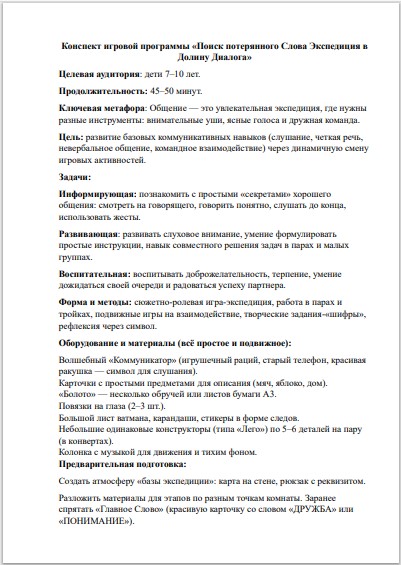 Хотите, чтобы дети 7–10 лет научились слышать друг друга и договариваться без ссор? Представляем готовый конспект игровой программы «Поиск потерянного Слова: Экспедиция в Долину Диалога». Это динамичный тренинг коммуникативных навыков в формате захватывающего приключения, полностью соответствующий требованиям ФГОС НОО.