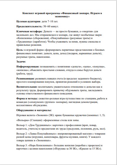 Думаете, объяснить детям 7–10 лет основы экономики — это сложно? Представляем готовый конспект игровой программы «Финансовый зоопарк: Играем в экономику». Эта уникальная методическая разработка по ФГОС превращает первое знакомство с бюджетом в увлекательное сафари, где вместо зубрежки дети учатся ответственности и планированию.