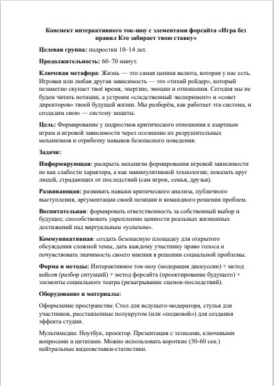 Как говорить с современными подростками об игровой зависимости так, чтобы они не «отключились» на первой же минуте? Представляем готовый конспект интерактивного ток-шоу с элементами форсайта «Игра без правил: Кто забирает твою ставку?». Это не скучная лекция, а полноценное интеллектуальное расследование для ребят 10–14 лет, соответствующее требованиям ФГОС по формированию цифровой грамотности и безопасности.