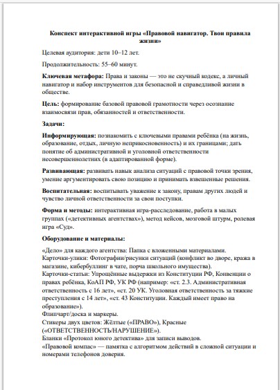 «Правовой навигатор» — это готовый сценарий интерактивной игры, где дети не слушают про законы, а сами расследуют «уголовные дела»: кибербуллинг, порчу имущества, драки. Они не заучивают статьи, а в роли следователей и судей учатся отличать правонарушение от шалости и понимать реальные последствия своих поступков.
