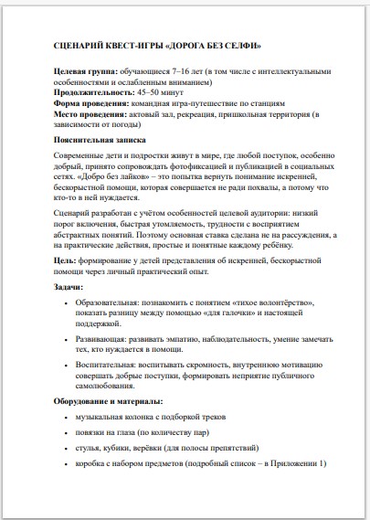 Как объяснить современным детям, что добро не нуждается в фото и лайках? Как научить помогать искренне, а не ради похвалы в соцсетях? Специально для педагогов, работающих с разновозрастными группами, в том числе с детьми с особенностями развития и ослабленным вниманием, разработан сценарий квест-игры «Дорога без селфи».