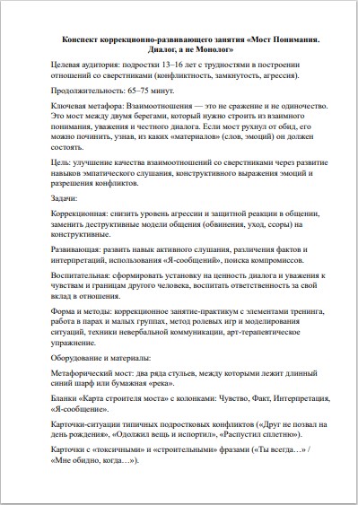 - Полностью готовый комплект: Конспект содержит подробный ход мероприятия (65–75 минут), бланки «Карта строителя моста», карточки с фразами и арт-материалы — бери и проводи .