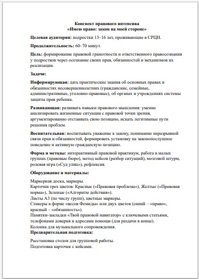 Методический материал идеально адаптирован для социальных педагогов, психологов, классных руководителей и воспитателей СРЦН. Он позволяет провести не формальную беседу, а полноценный тренинг по правовой грамотности.