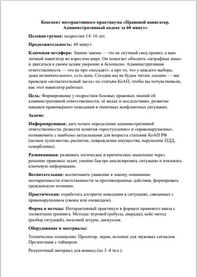 Конспект практикума «Правовой навигатор. Административный кодекс»: сценарий занятия по Административному кодексу (КоАП РФ) для подростков 14–16 лет (СРЦН/школа)