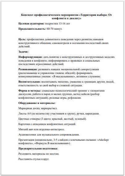 Результат: Вы экономите более 5 часов на подготовке и проводите мощное занятие, превращающее потенциальный конфликт в конструктивный опыт общения.
