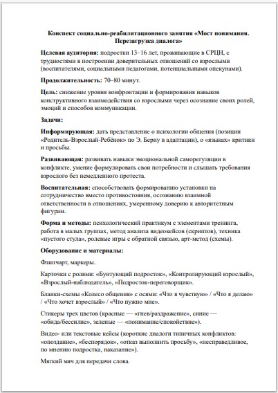 Постоянные конфликты, бунт и стена непонимания между подростками и взрослыми в СРЦН? Представляем готовый конспект социально-реабилитационного занятия, который поможет психологам и воспитателям перезагрузить этот диалог и снизить уровень конфронтации.