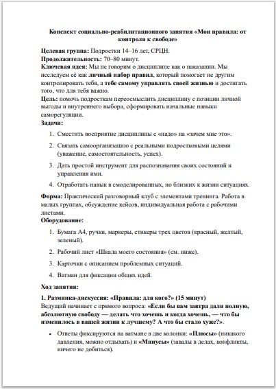 Конспект социально-реабилитационного занятия «Мои правила: от контроля к свободе»: саморегуляция, 14–16 лет (ФГОС, СРЦН)