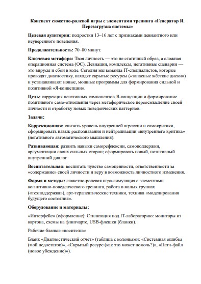 Устали бороться с подростковыми протестами и низкой самооценкой через нотации? Представляем готовый конспект сюжетно-ролевой игры с элементами тренинга «Генератор Я: Перезагрузка системы». Это инновационная «хакерская сессия» по взлому негативных установок для ребят 13–16 лет, разработанная в соответствии с требованиями ФГОС по развитию личностных УУД и самоопределению.