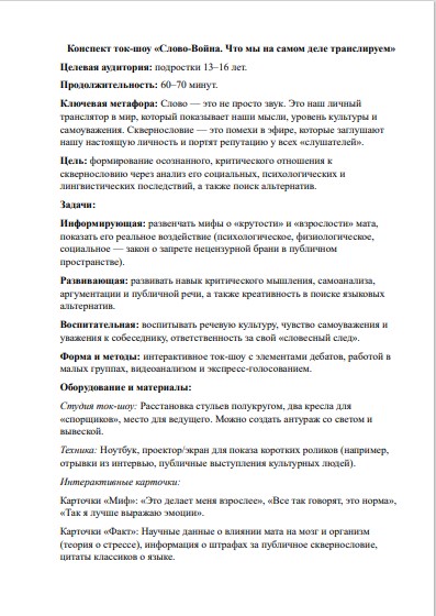 Конспект ток-шоу по культуре речи «Слово-Война» (13–16 лет) ФГОС: профилактика сквернословия