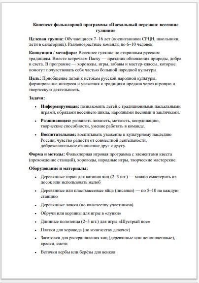 Готовый конспект фольклорной программы «Пасхальный перезвон» — это комплексное решение для педагогов и воспитателей СРЦН по приобщению детей 7–16 лет к истокам русской народной культуры. Этот сценарий сэкономит ваши силы при подготовке к весенним праздникам, предлагая методически выверенный формат игрового квеста, который полностью соответствует требованиям ФГОС по направлению духовно-нравственного воспитания.