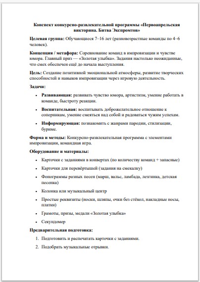 Готовый конспект конкурсно-развлекательной программы «Первоапрельская викторина. Битва Экспромтов» — это ваш идеальный план для проведения Дня смеха, который гарантированно вовлечет детей от 7 до 16 лет. Забудьте о долгой подготовке реквизита и заучивании ролей: вся концепция строится на мгновенной импровизации и творческом драйве здесь и сейчас.