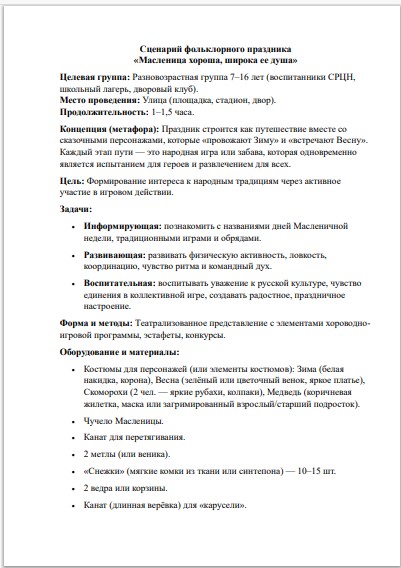 Как провести Масленицу так, чтобы дети и подростки 7–16 лет не просто ели блины, а погрузились в атмосферу русских традиций и активно отдохнули на свежем воздухе? Представляем вам готовый сценарий фольклорного праздника «Масленица хороша, широка ее душа». Это мощный методический инструмент для педагогов СРЦН, воспитателей, вожатых и организаторов дворовых клубов. Материал использует захватывающую метафору путешествия со сказочными персонажами для формирования интереса к народной культуре и физической активности в рамках требований ФГОС.