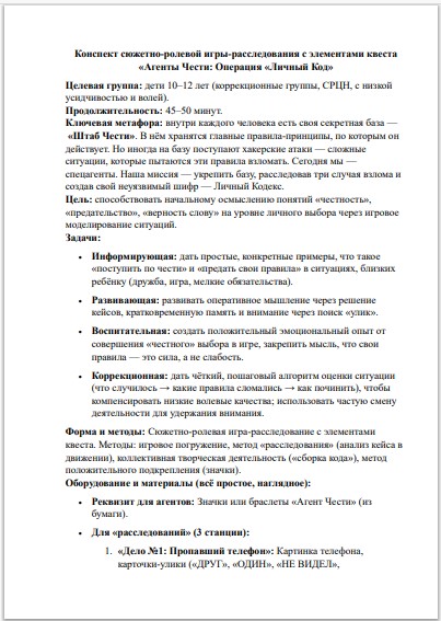 Устали бороться с низкой мотивацией и неусидчивостью детей 10–12 лет на стандартных классных часах? Этот готовый конспект сюжетно-ролевой игры-расследования «Агенты Чести: Операция «Личный Код» — ваше спасение и мощный инструмент профилактики девиантного поведения. Материал идеально подходит для коррекционных групп, работы в СРЦН (социально-реабилитационных центрах) и любых коллективов, где требуется игровое моделирование этических ситуаций в рамках ФГОС.