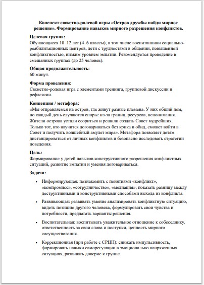 Сюжетно-ролевая игра «Остров дружбы: найди мирное решение»: разрешение конфликтов, 10–12 лет (ФГОС, СРЦН)