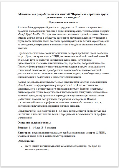 Методическая разработка цикла занятий «Первое мая — праздник труда» — это комплексный инструмент для педагогов и психологов, направленный на решение одной из самых сложных задач в работе с подростками 11–14 лет: формирование осознанного отношения к труду. В условиях СРЦН, где дети часто имеют негативный семейный опыт и склонность к иждивенчеству, этот материал становится фундаментом для их успешной социализации и подготовки к самостоятельной жизни.