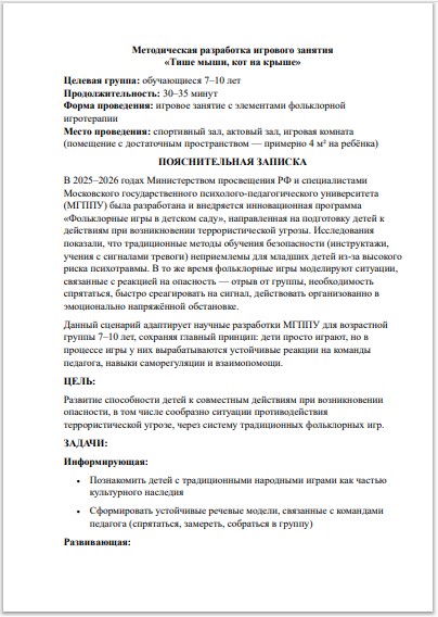 Готовый конспект игрового занятия «Тише мыши, кот на крыше» — это инновационный подход к обучению детей безопасному поведению в стрессовых ситуациях, разработанный специалистами МГППУ. Материал адаптирует научные разработки для возрастной группы 7–10 лет, позволяя педагогам сэкономить время и получить эффективный инструмент, который формирует устойчивые реакции на опасность без риска психотравмы, в отличие от традиционных инструктажей.