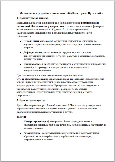 Как помочь подросткам 12–14 лет с низкой самооценкой и социальной неуверенностью найти свои сильные стороны и поверить в себя? Представляем вам готовый цикл из 7 социально-психологических занятий «Лига героев: Путь к себе». Это мощная профилактическая программа для педагогов СРЦН, психологов и классных руководителей, которая через последовательный опыт успеха и игровую метафору создает условия для «перезагрузки» самоотношения в рамках требований ФГОС.