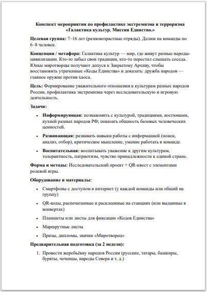Методическая разработка инновационного QR-квеста «Галактика культур. Миссия Единство» — это готовый сценарий для работы с разновозрастными группами, который превращает сложную тему профилактики экстремизма в захватывающее космическое приключение. Концепция «Галактики культур» позволяет мягко и эффективно донести до подростков ценности толерантности и единства, избегая назидательности и скучных лекций.